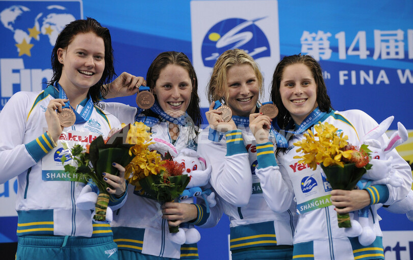 銅メダルを獲得し、表彰式に臨むオーストラリアの選手(2011年7月30日撮影)。(c)AFP/PETER PARKS