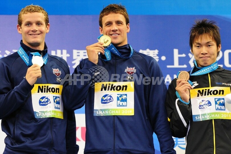 表彰式に臨む(左から)銀メダルのタイラー・クラリー、金メダルのライアン・ロクテ、銅メダルの堀畑裕也(2011年7月31日撮影)。(c)AFP/MARK RALSTON