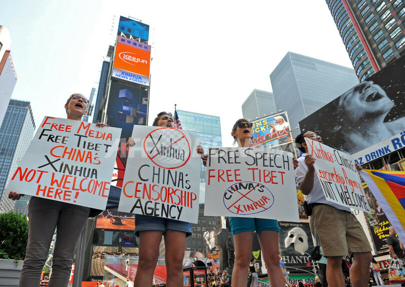 一方、チベット独立を支援する学生組織「自由チベット学生運動(Students For A Free Tibet)」(本部:ニューヨーク)のメンバー数人が、新華社のネオン広告の下で「新華社は中国の検閲機関」と書いたプラカードなどを持って抗議した。(c)AFP