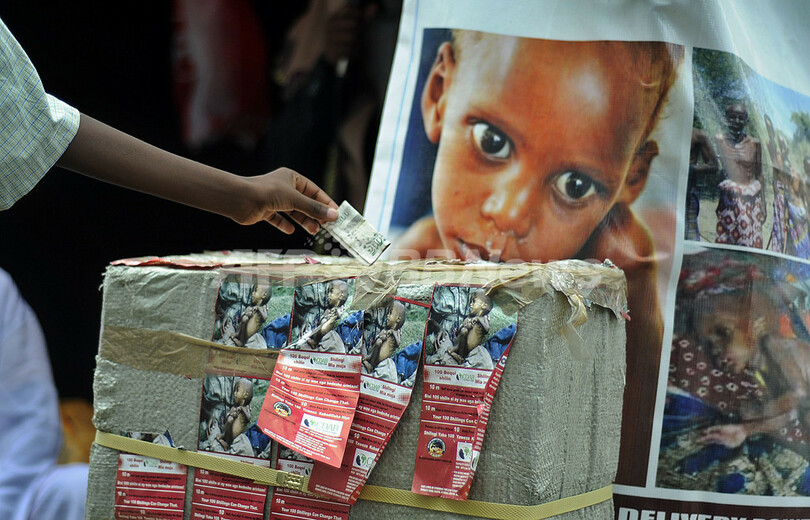 写真は、ケニアの首都ナイロビ(Nairobi)に設けられた募金箱(2011年7月29日撮影)。(c)AFP/Tony KARUMBA