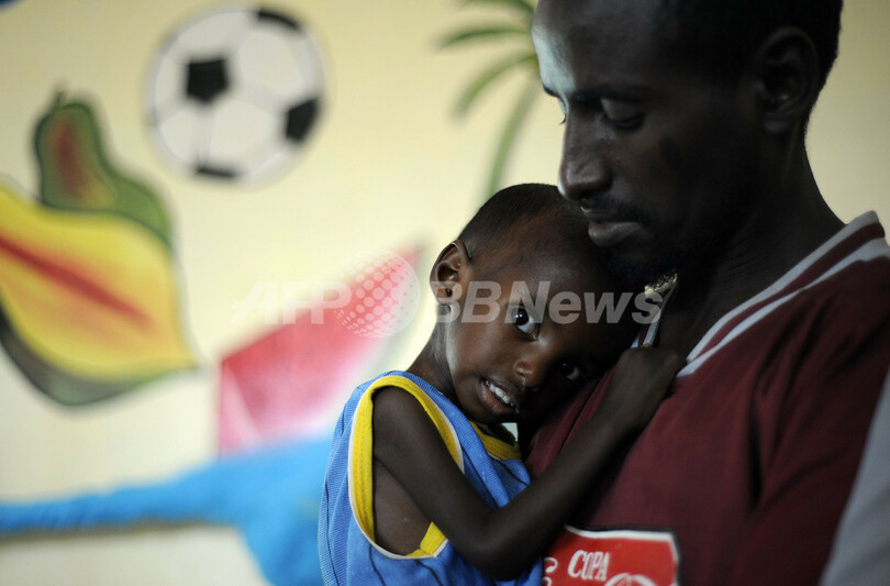 写真は、ダダール難民キャンプで栄養失調による死の瀬戸際から回復しつつある男の子(2011年8月2日撮影)。(c)AFP/Tony KARUMBA