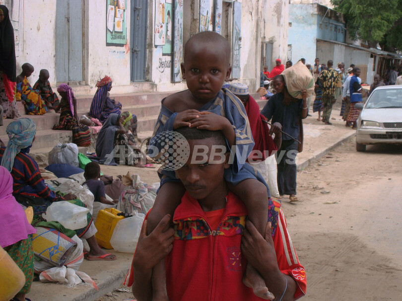 写真は、ソマリアの首都モガディシオ(Mogadishu)に逃れてきた父子(2011年8月3日撮影)。(c)AFP/MUSTAFA ABDI