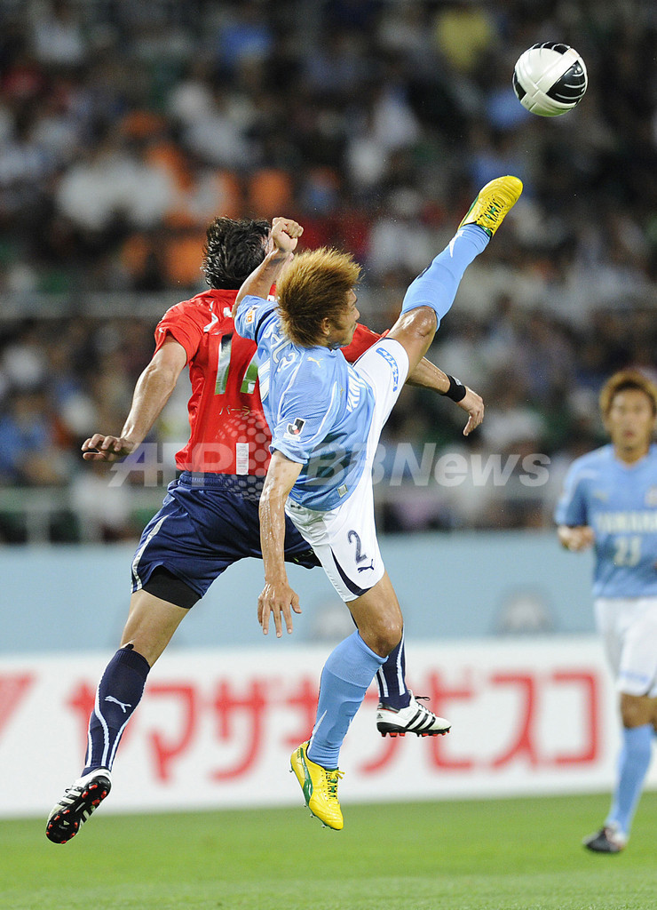 ボールを競るインデペンディエンテのファクンド・パッラ(Facundo Parra)とジュビロ磐田の加賀健一(Kenichi Kaga、2011年8月3日撮影)。(c)AFP/Toru YAMANAKA