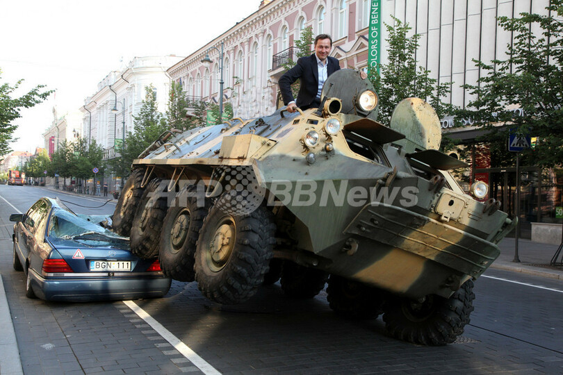 【8月4日 AFP】リトアニアの首都ビリニュス(Vilnius)で7月30日、自転車専用レーンに違法駐車していた高級車メルセデス・ベンツSクラス(Mercedes Benz)が、アルテュラス・ズオカス(Arturas Zuokas)市長(43)自ら操縦する装甲車に無残に押しつぶされる「事件」があった。 実はこれ、違法駐車対策に取り組むズオカス市長による斬新なパフォーマンス。市広報によると、つぶされたSクラスも、このために市が用意したものという。(c)AFP