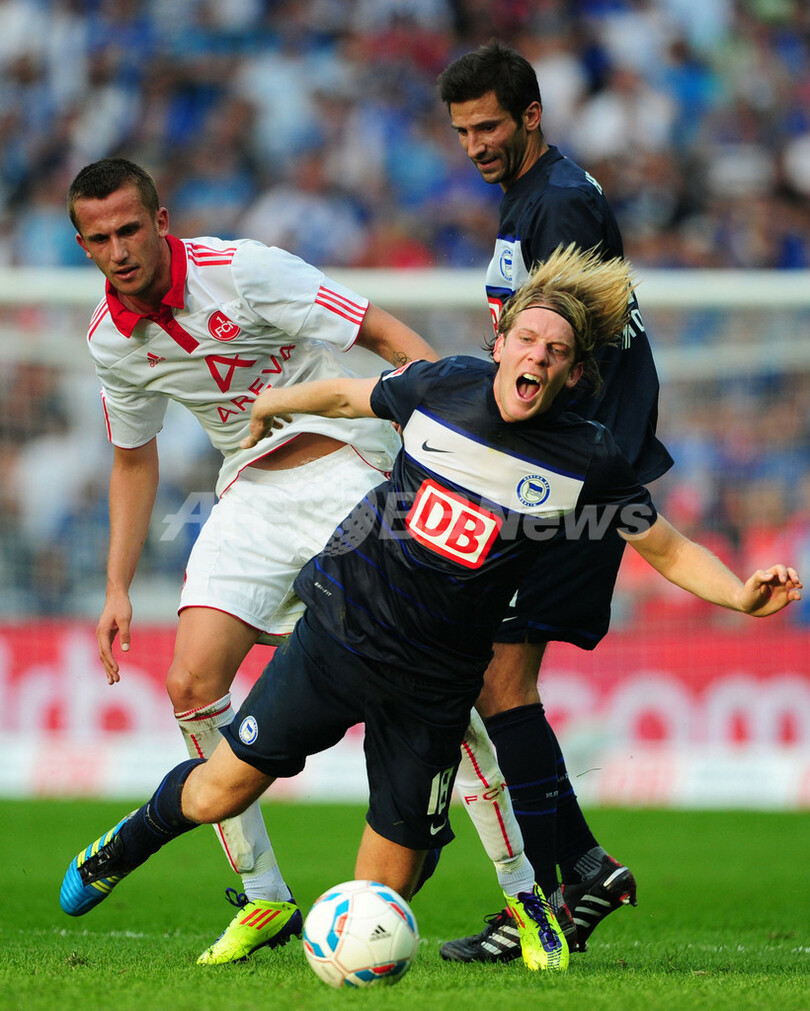 また昇格組では、2部制覇で1部リーグに復帰を決めたヘルタ・ベルリン(Hertha Berlin)が0-1でニュルンベルク(1. FC Nuremberg)に敗れ、FCアウクスブルク(FC Augsburg)はSCフライブルク(SC Freiburg)と2-2で引き分けている。(c)AFP/Ryland James