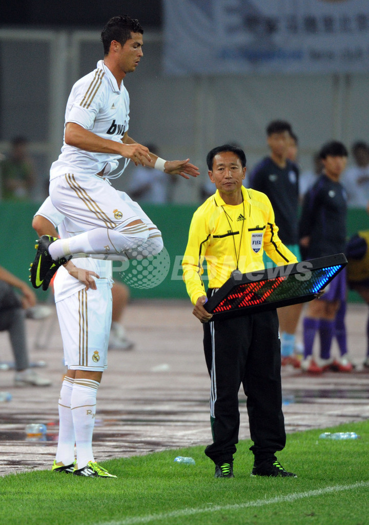 途中出場を前に、ピッチ脇でジャンプするレアル・マドリードのクリスティアーノ・ロナウド(Cristiano Ronaldo、2011年8月6日撮影)。(c)AFP/Mark RALSTON
