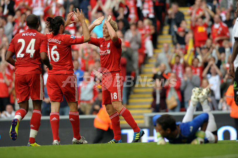 試合終了間際に追加点を決め、ソティリオス・キルギアコス(Sotirios Kyrgiakos、左から2人目)とハイタッチを交わすリバプールのディルク・カイト(Dirk Kuyt、中央、2011年8月6日撮影)。(c)AFP/PAUL ELLIS