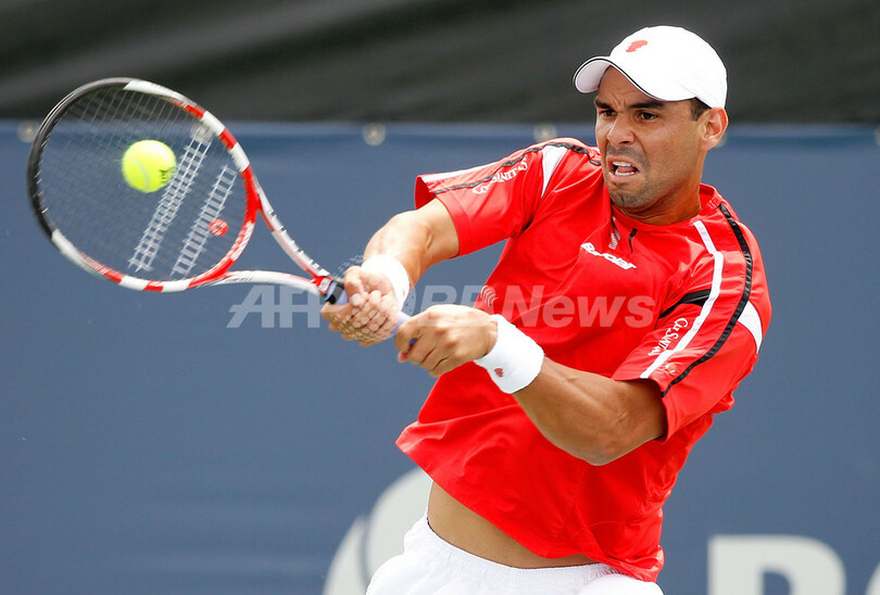 シングルス1回戦でセルビアのヤンコ・ティプサレビッチ(Janko Tipsarevic)に5-7、1-6で敗れたコロンビアのアレハンドロ・ファリャ(Alejandro Falla、2011年8月9日撮影)。(c)AFP/Getty Images/Matthew Stockman