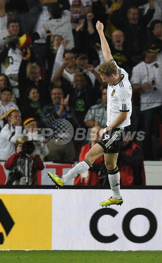 後半35分にゴールを決め、喜ぶドイツのアンドレ・シュールレ(Andre Schurrle、2011年8月10日撮影)。(c)AFP/THOMAS KIENZLE