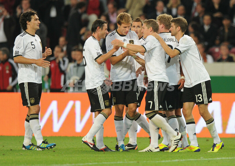 バスティアン・シュバインシュタイガー(Bastian Schweinsteiger)の先制ゴールを喜ぶドイツの選手(2011年8月10日撮影)。(c)AFP/CHRISTOF STACHE