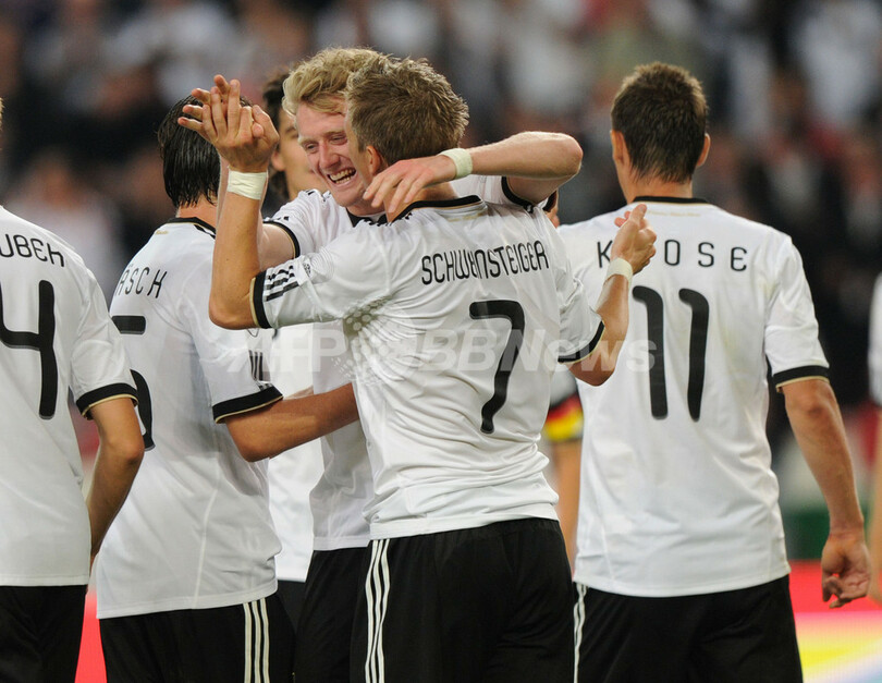 ゴールを喜ぶドイツのバスティアン・シュバインシュタイガー(Bastian Schweinsteiger、右から2人目)とアンドレ・シュールレ(Andre Shurrle2011年8月10日撮影)。(c)AFP/CHRISTOF STACHE
