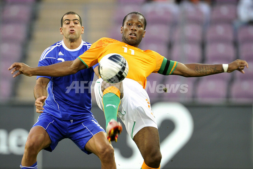 イスラエルのタル・ベン・ハイム(Tal Ben Haim、左)とボールを競るコートジボワールのディディエ・ドログバ(Didier Drogba、2011年8月10日撮影)。(c)AFP/FABRICE COFFRINI
