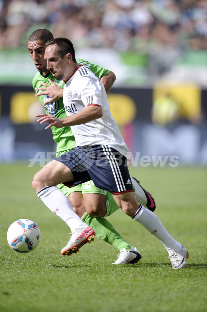 VfLボルフスブルクのアシュカン・デヤガ(Ashkan Dejagah、左)からチェックを受けるバイエルン・ミュンヘンのフランク・リベリ(Franck Ribery、2011年8月13日撮影)。(c)AFP/OLIVER HARDT