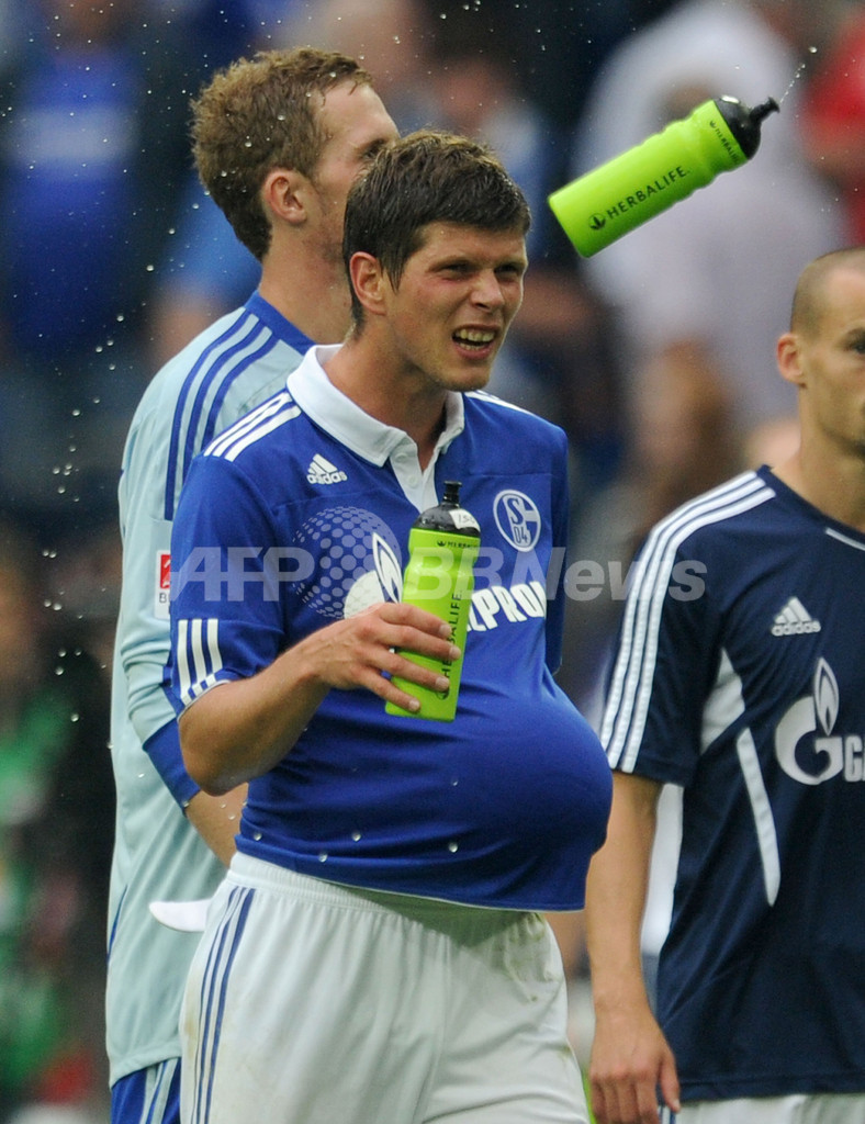 ハットトリックを達成し、試合後にボールをユニホームの中に入れて喜ぶシャルケ04のクラース・ヤン・フンテラール(Klaas-Jan Huntelaar、2011年8月13日撮影)。(c)AFP/PATRIK STOLLARZ