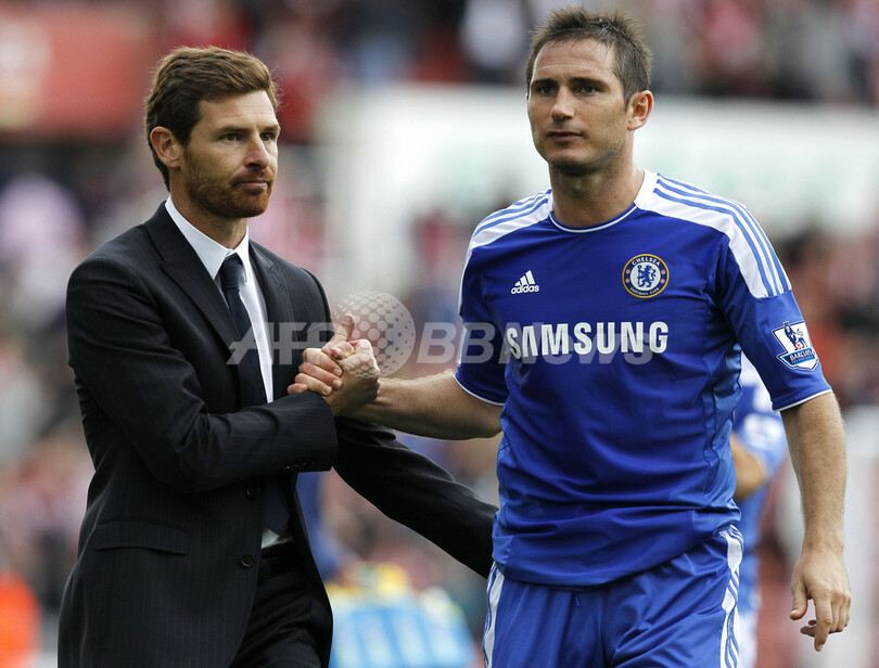 試合後、フランク・ランパード(Frank Lampard、右)と握手を交わすチェルシーのアンドレ・ビラス・ボアス監督(Andre Villas-Boas、2011年8月14日撮影)。(c)AFP/IAN KINGTON