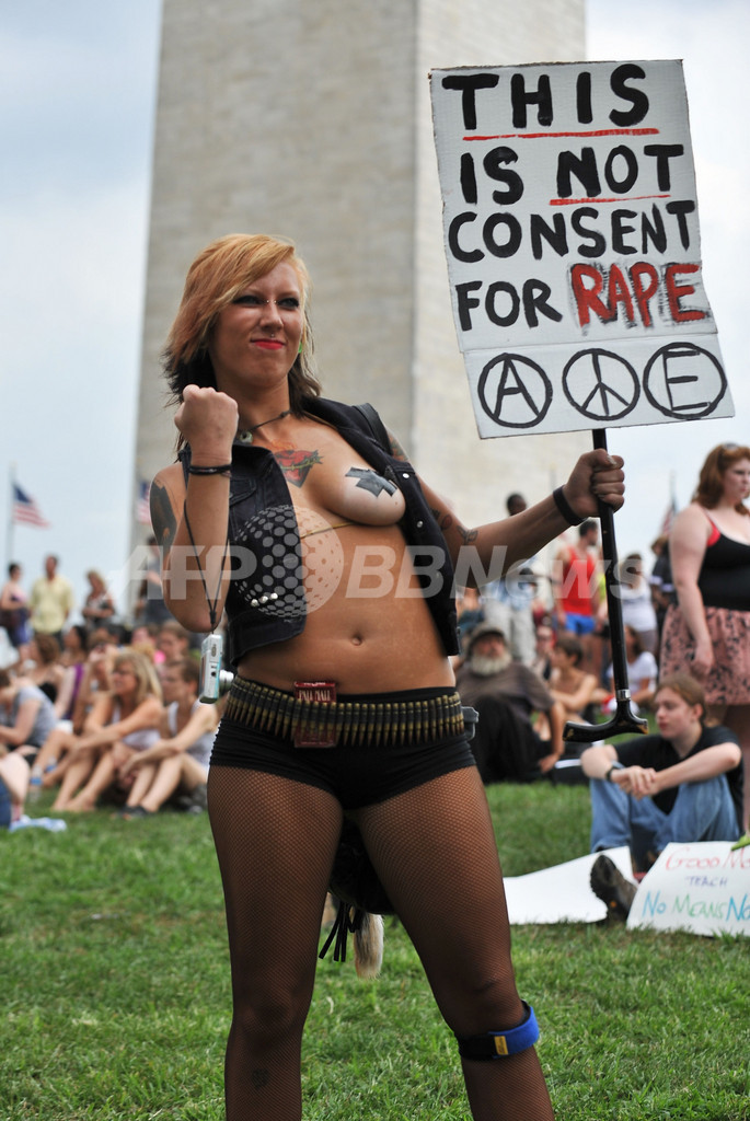 【8月15日 AFP】性犯罪被害を女性の服装と関連づけるのはやめようと訴えるデモ「スラット・ウォーク(SlutWalk)」が13日、米ワシントンD.C.(Washington D.C.)で開かれた。この運動はカナダのトロント(Toronto)で4月、警察官が「性犯罪被害を避けるため、女性たちは、ふしだら(スラット)な服装をすべきではない」と発言したことに抗議する形で始まった。以来、ニュージーランドのオークランド(Auckland)とウェリントン(Wellington)、インドのニューデリー(New Delhi)、韓国・ソウル(Seoul)、オーストラリア・シドニー(Sydney)、米国フィラデルフィア(Philadelphia)など世界各地で行われている。(c)AFP