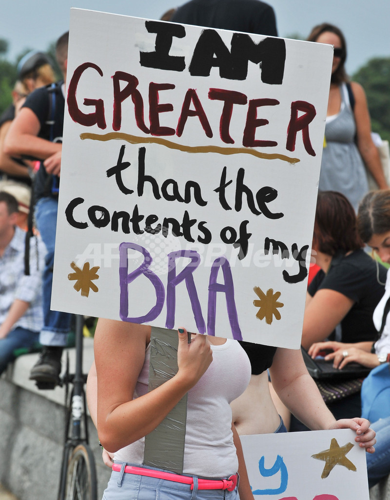 【8月15日 AFP】性犯罪被害を女性の服装と関連づけるのはやめようと訴えるデモ「スラット・ウォーク(SlutWalk)」が13日、米ワシントンD.C.(Washington D.C.)で開かれた。この運動はカナダのトロント(Toronto)で4月、警察官が「性犯罪被害を避けるため、女性たちは、ふしだら(スラット)な服装をすべきではない」と発言したことに抗議する形で始まった。以来、ニュージーランドのオークランド(Auckland)とウェリントン(Wellington)、インドのニューデリー(New Delhi)、韓国・ソウル(Seoul)、オーストラリア・シドニー(Sydney)、米国フィラデルフィア(Philadelphia)など世界各地で行われている。(c)AFP