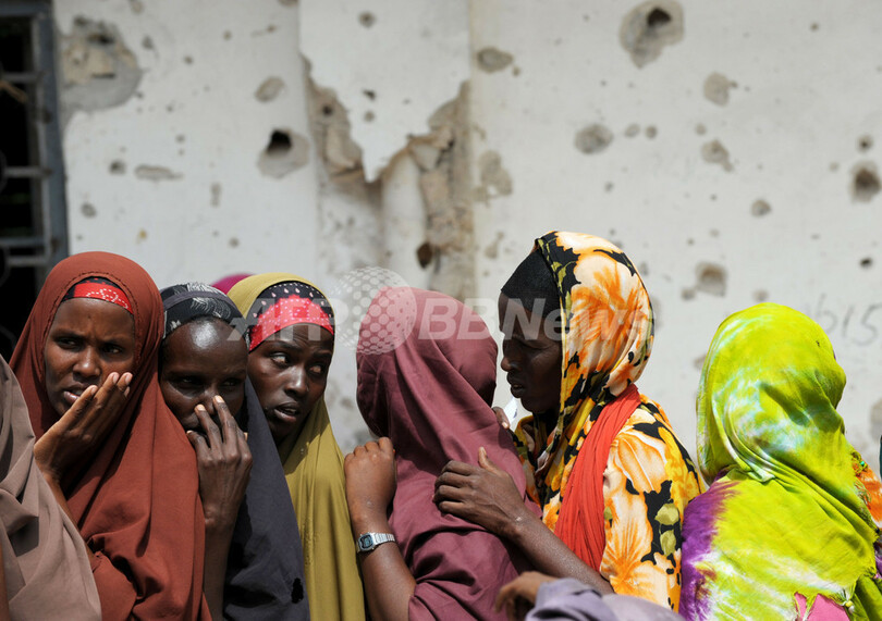 写真はモガディシオで、銃弾で穴が開いた壁の前で食糧配給の列に並ぶ女性たち(2011年8月14日撮影)。(c)AFP/ROBERTO SCHMIDT