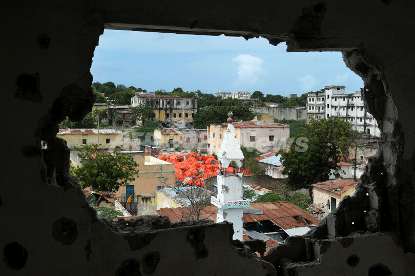 写真はモガディシオの廃虚からのぞむ、破壊されたモスク(手前)と避難民キャンプ(2011年8月14日撮影)。(c)AFP/ROBERTO SCHMIDT