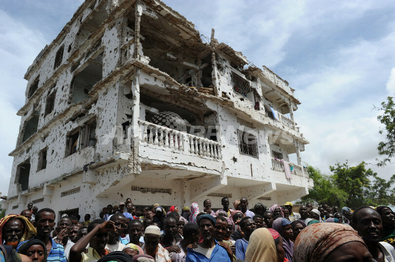 写真はモガディシオで、部分的に破壊された建物の周りに集まる避難民たち(2011年8月14日撮影)。(c)AFP/ROBERTO SCHMIDT