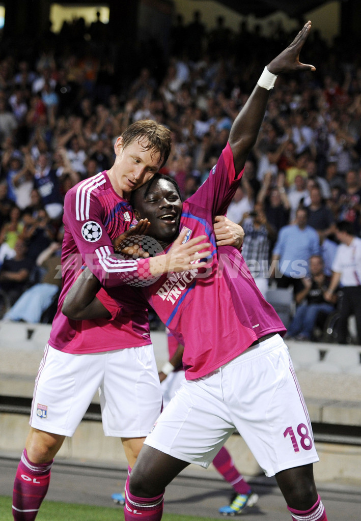 前半10分に同点ゴールを決め、チームメイトのキム・カルストロム(Kim Kallstrom、左)に祝福されるオリンピック・リヨンのバフェタンビ・ゴミス(Bafetimbi Gomis、右、2011年8月16日撮影)。(c)AFP/PHILIPPE DESMAZES