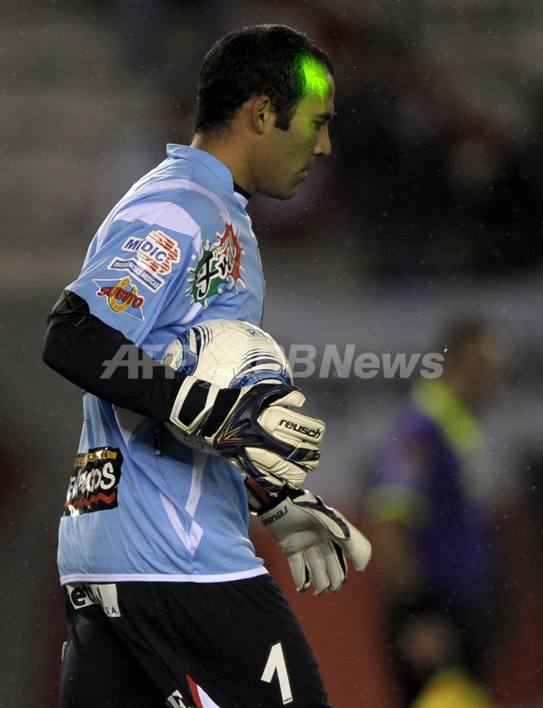 試合中、顔にレーザー光線を向けられるチャカリタ・ジュニアーズのGKニコラス・タウベル(Nicolas Tauber、2011年8月16日撮影)。(c)AFP/Juan Mabromata