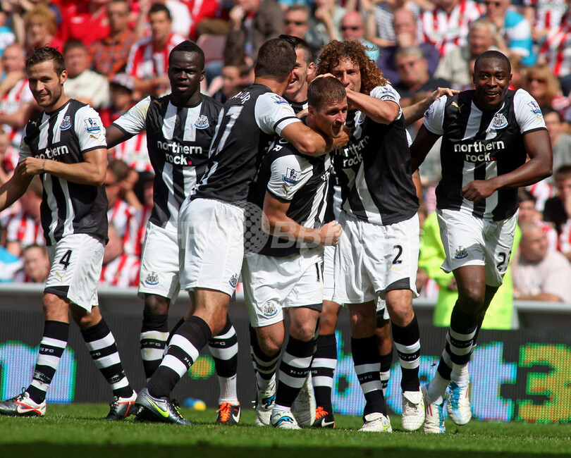 ゴールを決めチームメイトに祝福されるニューカッスルのライアン・テイラー(Ryan Taylor、右から3人目、2011年8月20日撮影)。(c)AFP/IAIN BUIST