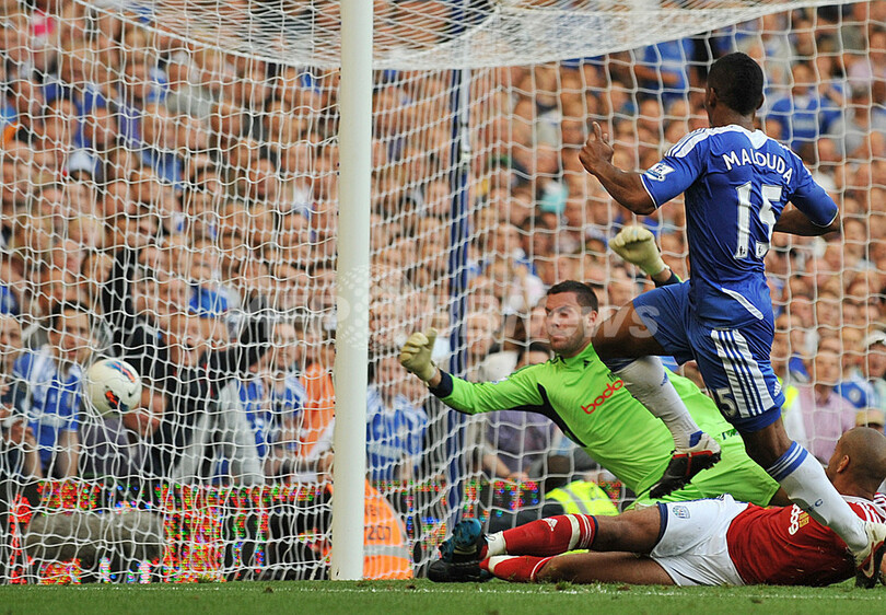 後半38分に逆転ゴールを決めるチェルシーのフローラン・マルーダ(Florent Malouda、右、2011年8月20日撮影)。(c)AFP/BEN STANSALL