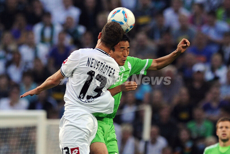 ボルシア・メンヘングラッドバッハのロマン・ノイシュテッター(Roman Neustaedter、左)とボールを競るVfLボルフスブルクの長谷部誠(Makoto Hasebe、2011年8月19日撮影)。(c)AFP/PATRIK STOLLARZ