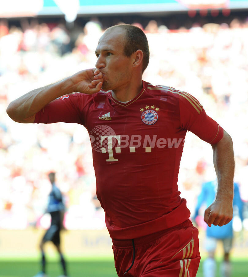 前半34分にチームの3点目となるゴールを決め、喜ぶバイエルン・ミュンヘンのアリエン・ロッベン(Arjen Robben、2011年8月20日撮影)。(c)AFP/CHRISTOF STACHE