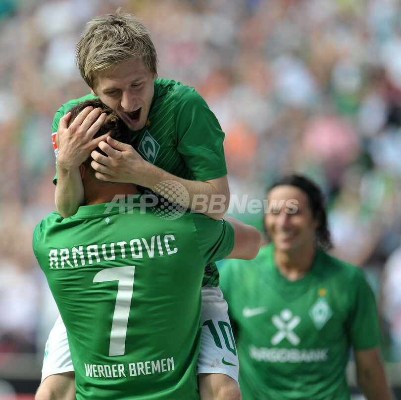 後半20分に勝ち越しゴールを決めたマルコ・アルナウトビッチ(Marko Arnautovic、下)に抱きついて喜ぶヴェルダー・ブレーメンのマルコ・マリン(Marko Marin、2011年8月20日撮影)。(c)AFP/CARMEN JASPERSEN