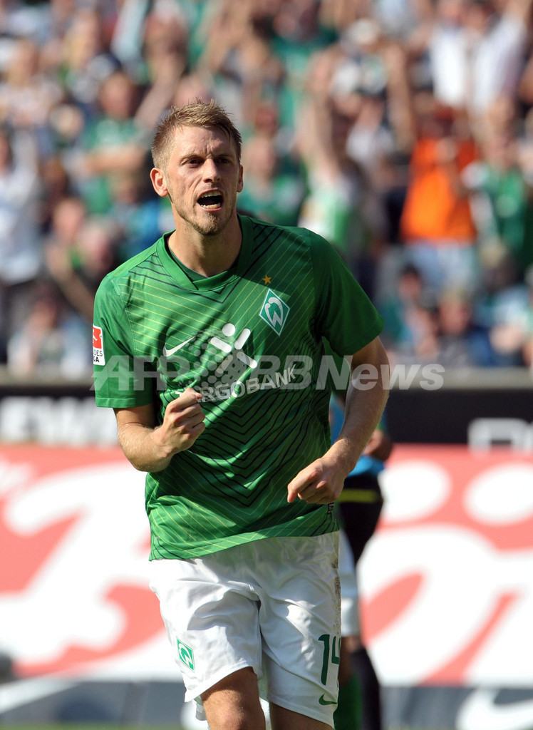 後半42分にゴールを決め、歓喜するヴェルダー・ブレーメンのアーロン・フント(Aaron Hunt、2011年8月20日撮影)。(c)AFP/CARMEN JASPERSEN