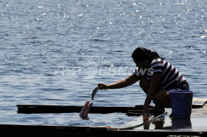 ブラジル北部、アマゾン川支流のネグロ川(Black River)沿いにあるTumbira村の景色。川の長さは約2230キロで、流域はブラジル、ベネズエラ、コロンビアの3か国にまたがっている。写真はイルカに餌をやる女性(2011年8月17日撮影)。(c)AFP/Evaristo SA