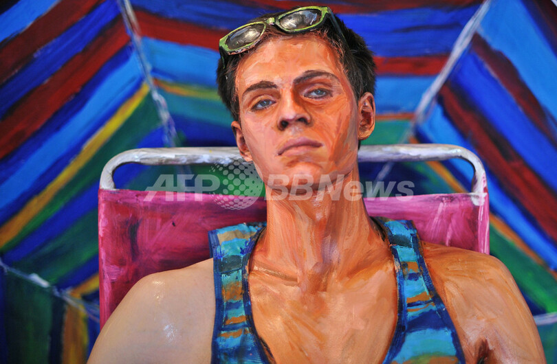 写真はボディーペインティングを施されるモデルの男性(2011年8月20日撮影)。(c)AFP/Nicholas KAMM