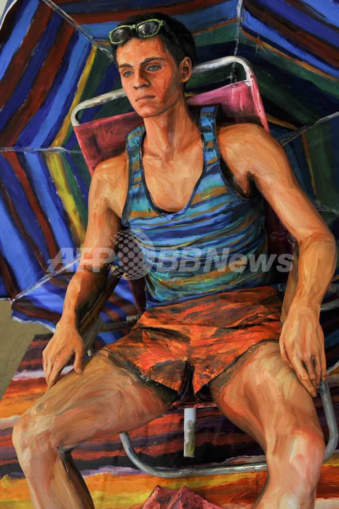 写真はボディーペインティングを施され、セットでポーズをとるモデルの男性(2011年8月20日撮影)。(c)AFP/Nicholas KAMM