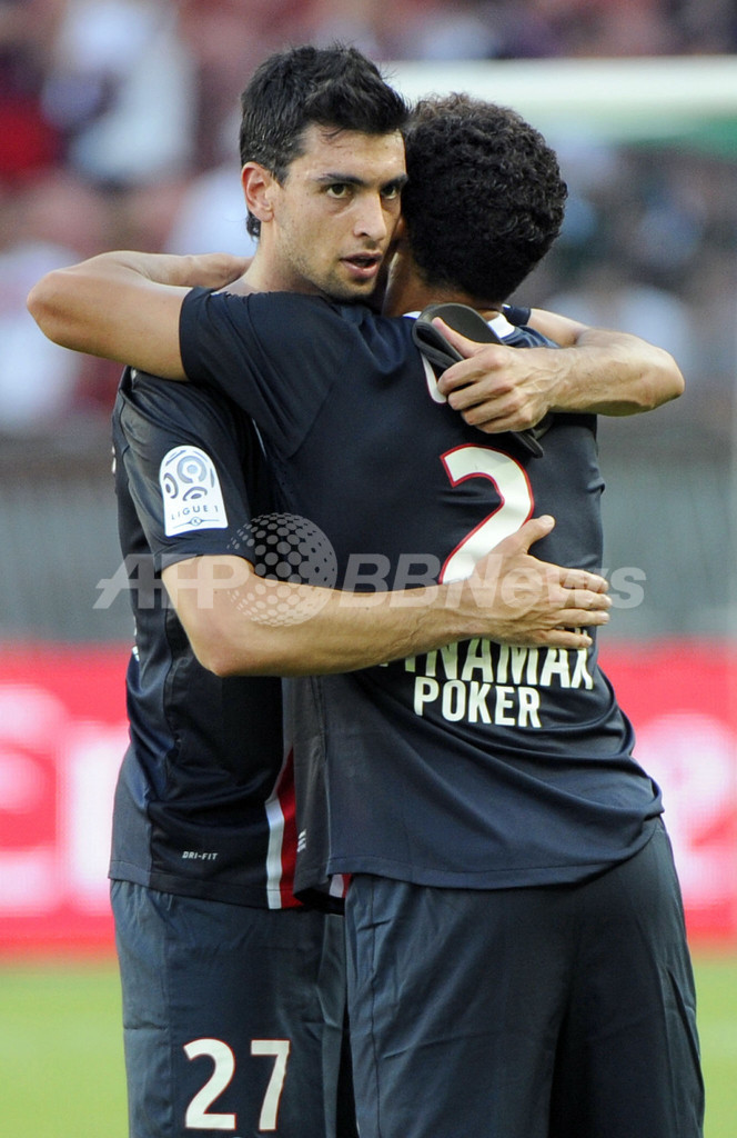 試合に勝利し、マルコス・セアラ(Marcos Ceara、右)と抱き合って喜ぶパリ・サンジェルマンのハビエル・パストレ(Javier Pastore、2011年8月21日撮影)。(c)AFP/BERTRAND GUAY