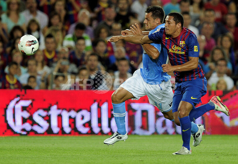 ナポリのクリスティアン・マッジョ(Christian Maggio、左)と競り合うFCバルセロナのアドリアーノ・コレイア(Adriano Correia、2011年8月22日撮影)。(c)AFP/JOSEP LAGO
