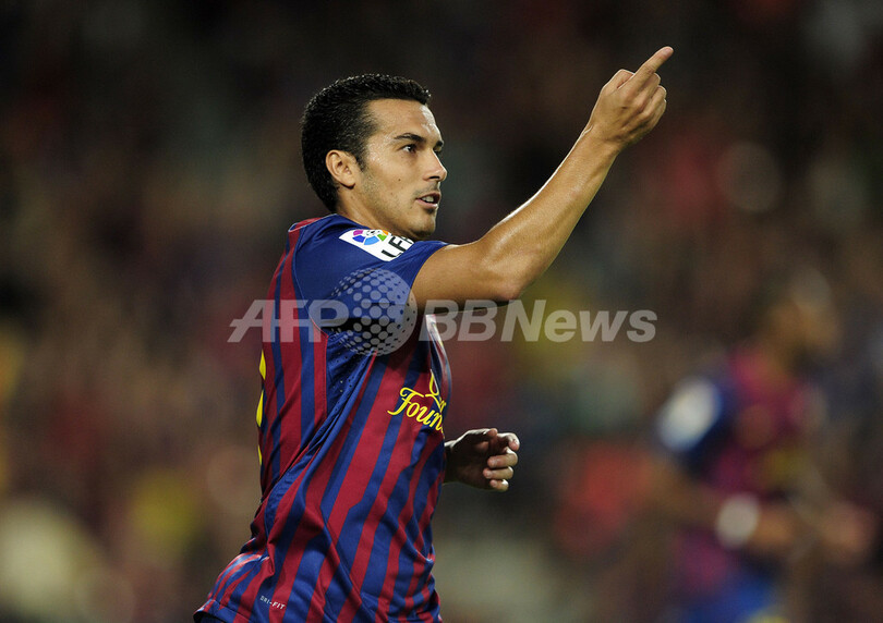 得点を決め喜ぶFCバルセロナのペドロ・ロドリゲス・レデスマ(Pedro Rodriguez Ledesma、2011年8月22日撮影)。(c)AFP/JOSEP LAGO