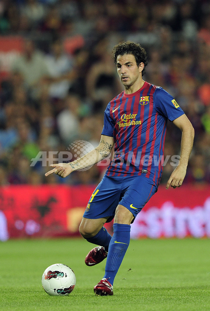 パスを出すFCバルセロナのセスク・ファブレガス(Cesc Fabregas、2011年8月22日撮影)。(c)AFP/JOSEP LAGO