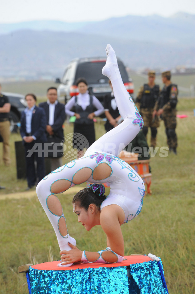 写真は、ナーダムでパフォーマンスを披露する曲芸師(2011年8月22日撮影)。(c)AFP/GOH CHAI HIN