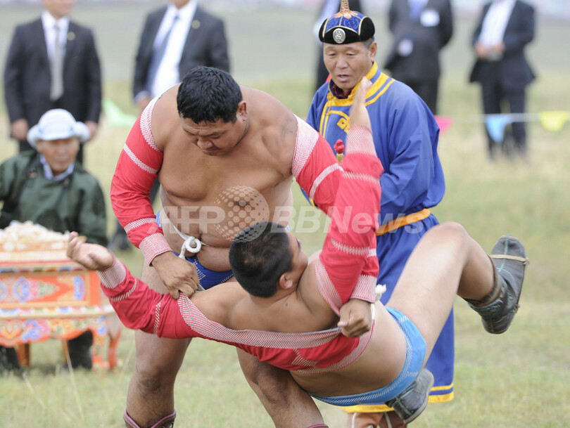 写真は、ナーダムで、相手選手を倒すモンゴル相撲の王者(2011年8月22日撮影)。(c)AFP/GOH CHAI HIN