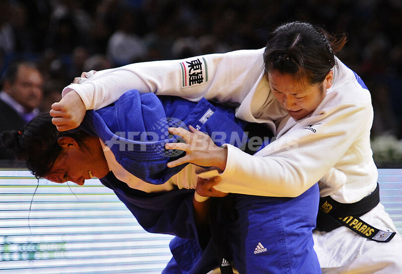 また、女子70キロ級では國原頼子(Yoriko Kunihara)が銅メダルを獲得、金メダルはリュシ・ドコス(Lucie Decosse、フランス)が手にしている。(c)AFP/Barnaby Chesterman