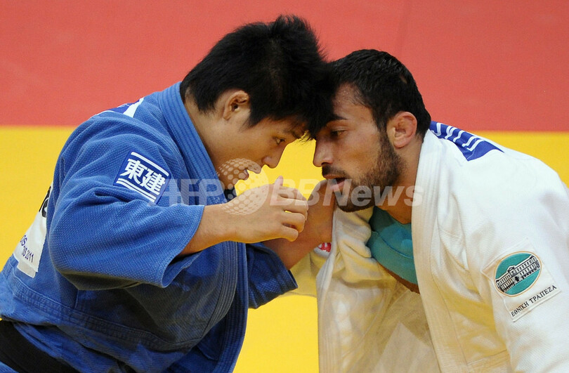 男子90キロ級決勝でイリアス・イリアディス(Ilias Iliadis、右)と対戦する西山大希(2011年8月26日撮影)。(c)AFP/BERTRAND LANGLOIS