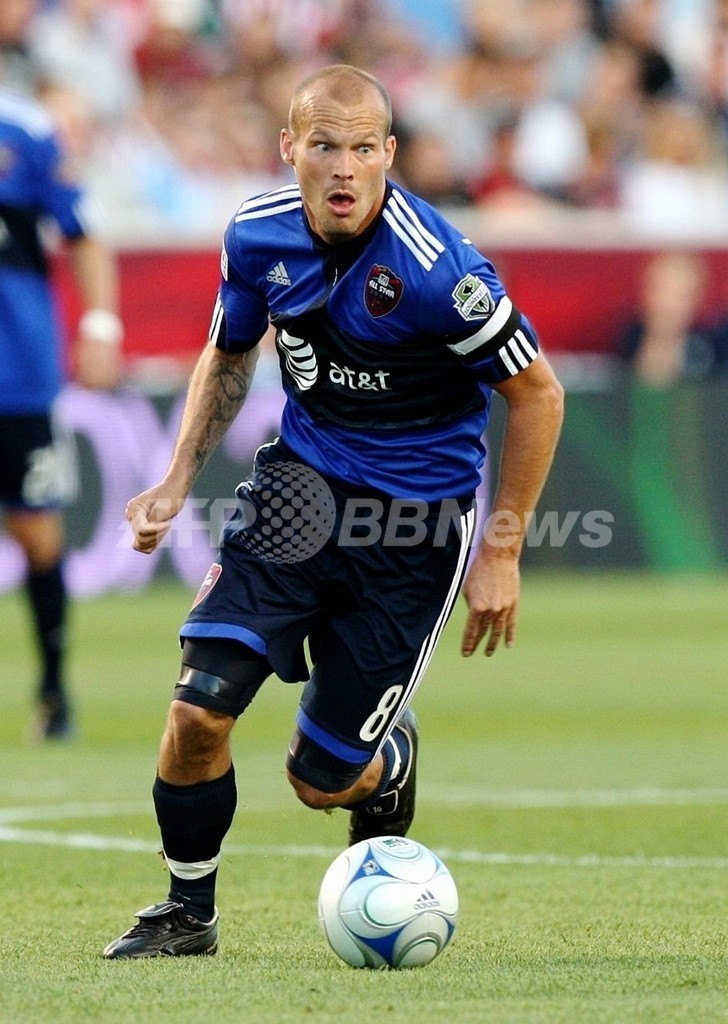 米メジャーリーグサッカー、オールスターゲーム(2009 MLS All-Star Game)。エバートン(Everton)戦にMLSオールスターとして出場するフレドリク・リュングベリ(Fredrik Ljungberg、2009年7月29日撮影)。(c)AFP/Getty Images/Jed Jacobsohn