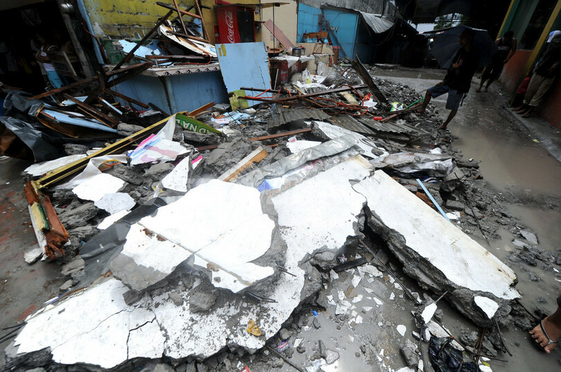 写真はフィリピン・マニラ(Manila)東部のケソン市(Quezon city)で、台風11号(Nanmadol)による強風で倒壊した壁を見つめる人びと(2011年8月28日撮影)。(c)AFP/NOEL CELIS