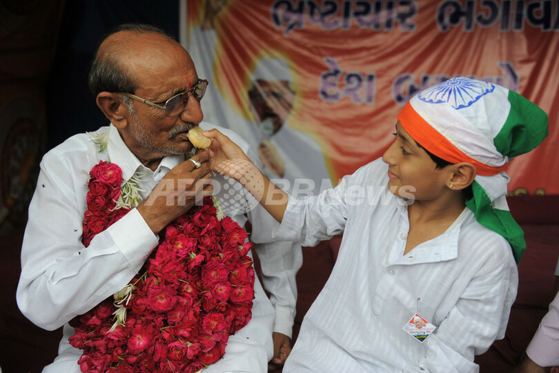 【8月29日 AFP】インドのニューデリー(New Delhi)で汚職撲滅を訴えてハンガーストライキを実施していた社会活動家のアンナ・ハザレ(Anna Hazare)氏(74)が28日、議会が同氏の主張を検討することに同意したことから、13日におよんだハンストを終えた。