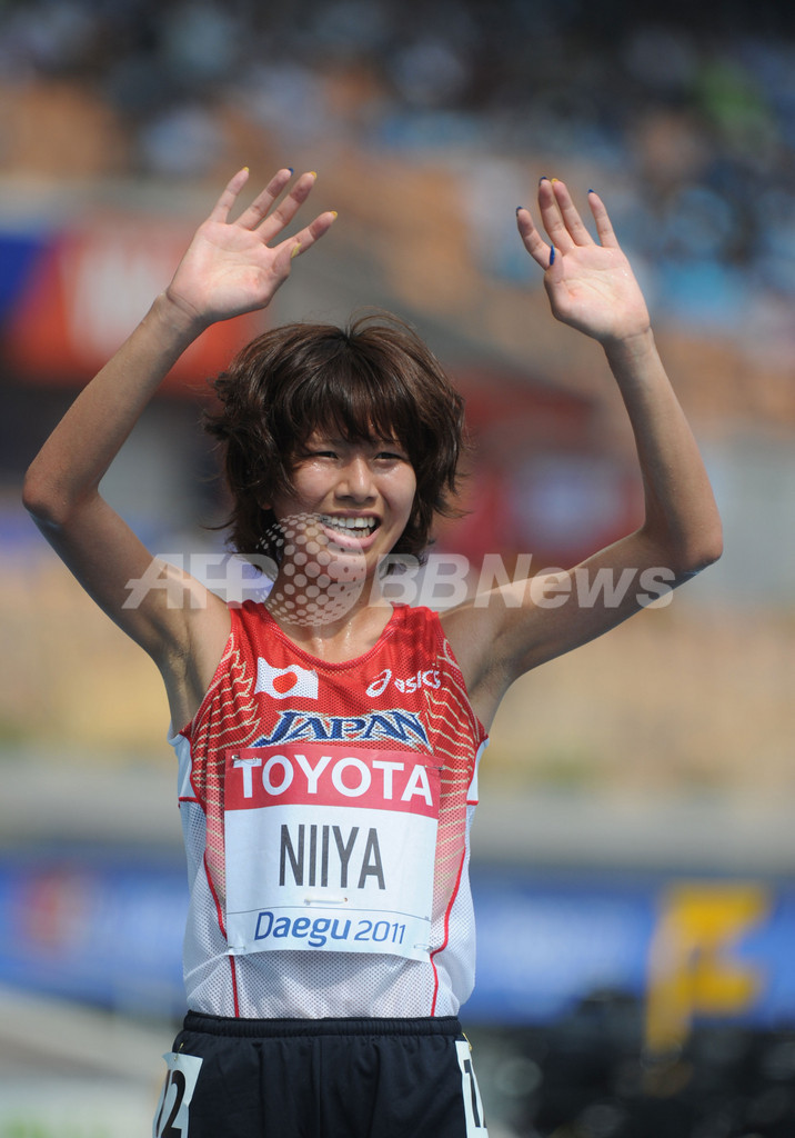 歓声に応える新谷仁美(2011年8月30日撮影)。(c)AFP/OLIVIER MORIN