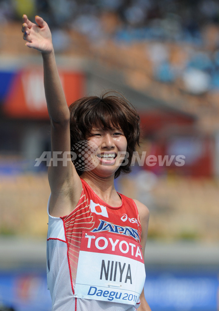 歓声に応える新谷仁美(2011年8月30日撮影)。(c)AFP/OLIVIER MORIN