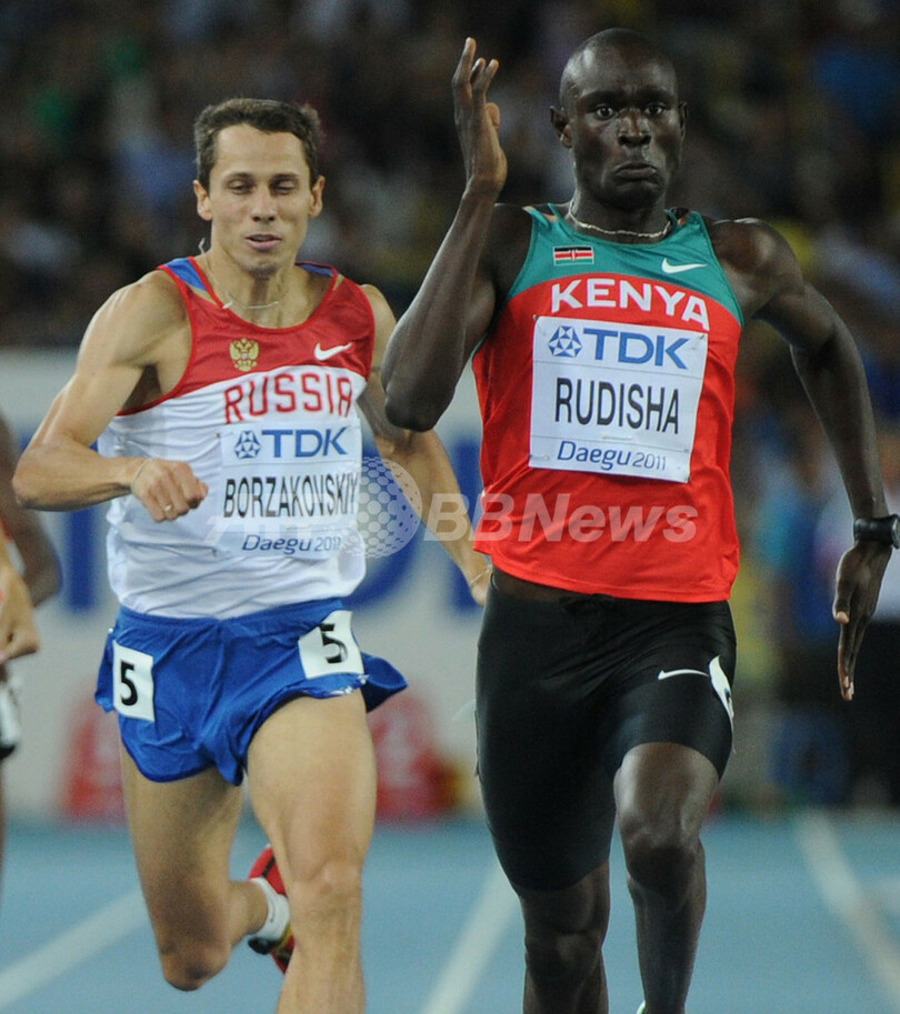 ロシアのユーリー・ボルザコフスキー(Yuriy Borzakovskiy、左)を振り切るデビッド・ルディシャ(2011年8月30日撮影)。(c)AFP/OLIVIER MORIN