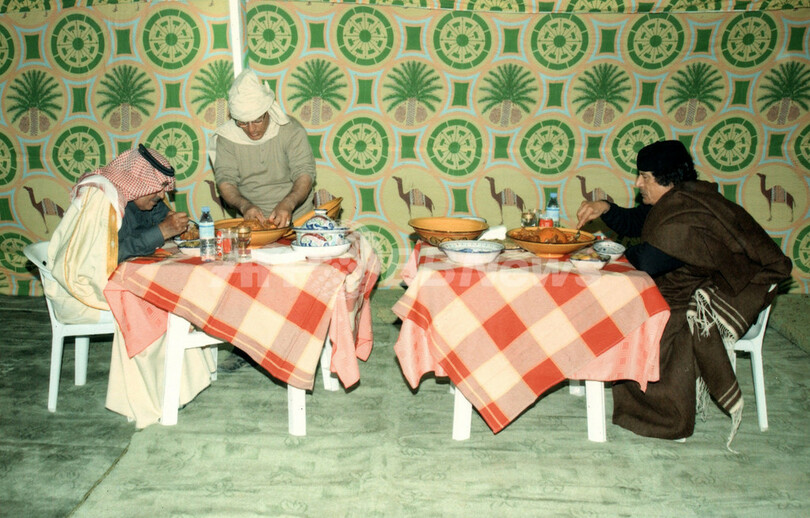写真はカダフィ家のアルバムより、サウジアラビアのナエフ・ビン・アブドルアジズ(Nayef bin Abdul Aziz)王子と会食するカダフィ大佐(右、撮影日不明、2011年8月30日入手)。(c)AFP